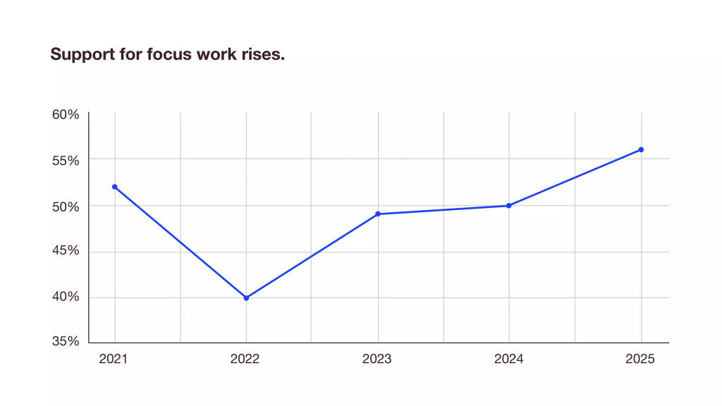Most U.S. employees spend nearly two-thirds of their time working alone, which is why they continue to report a need for better places to focus in the office. Leaders say they prioritize meeting and conference spaces ahead of those for focused work, although their support for adding more places to focus has increased over the last four years.