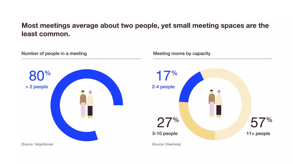 Even during mid-week busy days, big conference rooms sit underused. Steelcase partner VergeSense found that even during high-attendance Tuesdays, 2-4 person spaces are still used most often, 70-81% of the time. Rooms for five or more people are only used about half the time. (VergeSense, 2025).