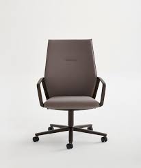Mid back task chair with open arms, polished aluminum base, and black plastic armcaps upholstered in Helvetia Hampton leather.