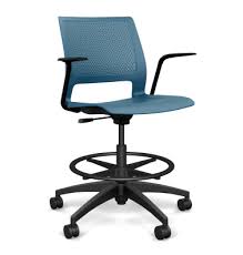 Extended height task stool with upholstered seat, plastic back, and armless design for versatile workspace seating.