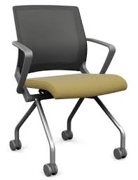 Upholstered back nesting chair with fixed arms, black frame and base, carpet casters, and Grade 5 Hobnob Forest fabric upholstery.