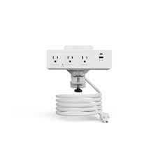 Clamp-mount power strip with 120-inch cord featuring 3 AC outlets, 1 USB-A port, and 1 USB-C port.