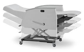 Motorized exam chair with lift, Trendelenburg positioning, straight back, Moxy back and bumpers, and central locking caster system.