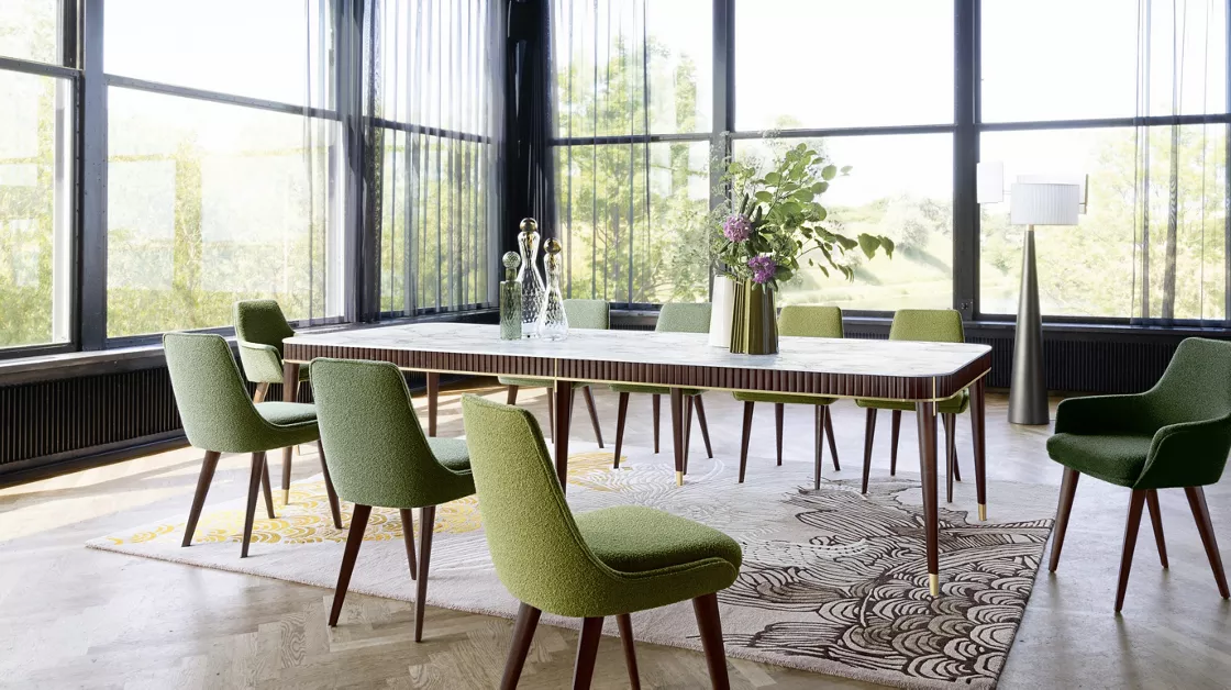 A sophisticated dining table with clean geometric lines and premium materials including wood and metal accents. Its elegant design makes it suitable for executive dining rooms and corporate hospitality spaces.
