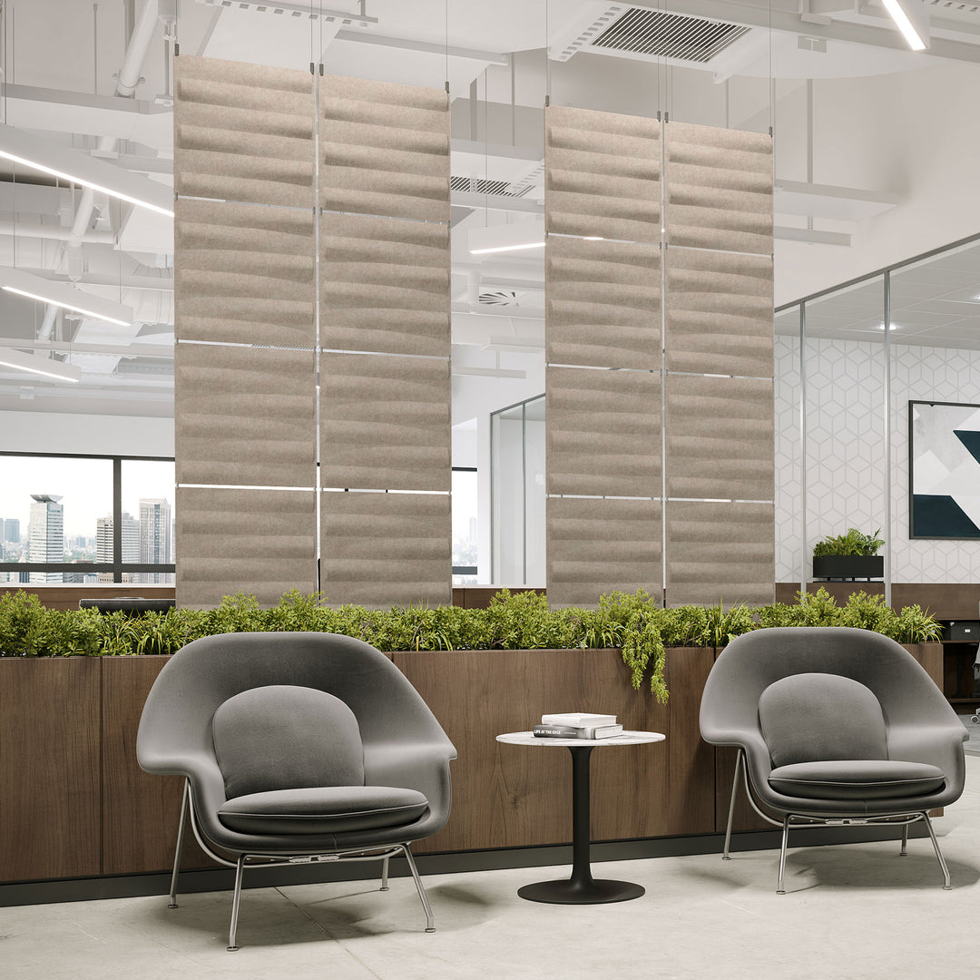 Sound-absorbing wall panels available in various colors and patterns to reduce noise levels in open office environments. Combines functional acoustic performance with decorative design elements.