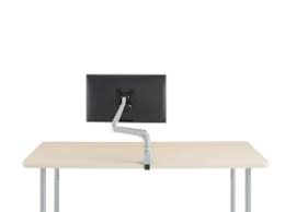Single monitor arm with two-piece clamp mount base in silver with gray trim.