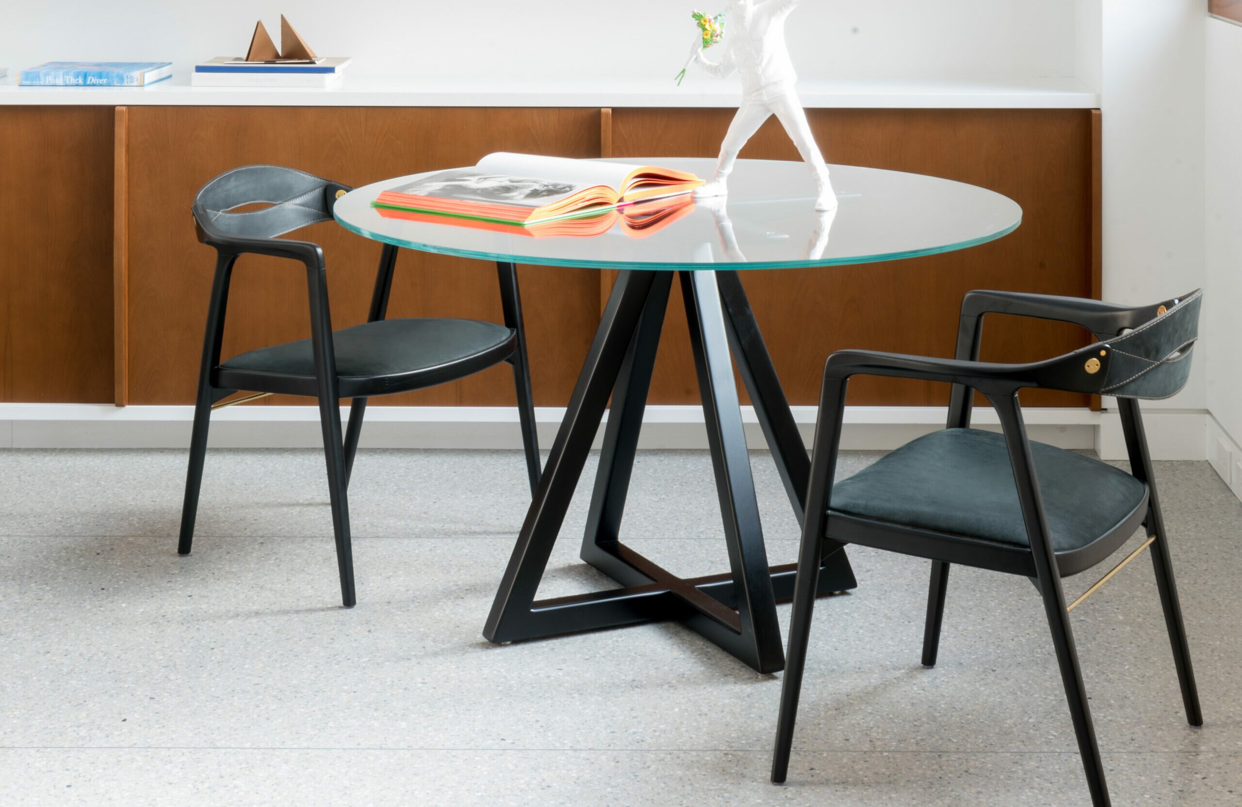 Modern dining table collection suitable for corporate dining rooms and hospitality venues. Available in various sizes with options for wood, stone, or metal tops and different base styles.
