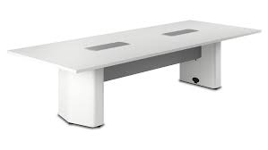 Rectangle conference table at working height with aluminum base and integrated wireway system.