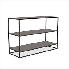 A low, open bookcase from the Greenpoint collection featuring natural oak shelving with dark bronze frame.