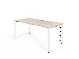 Rectangle conference table with laminate top, aluminum base, and integrated power devices with USB ports.
