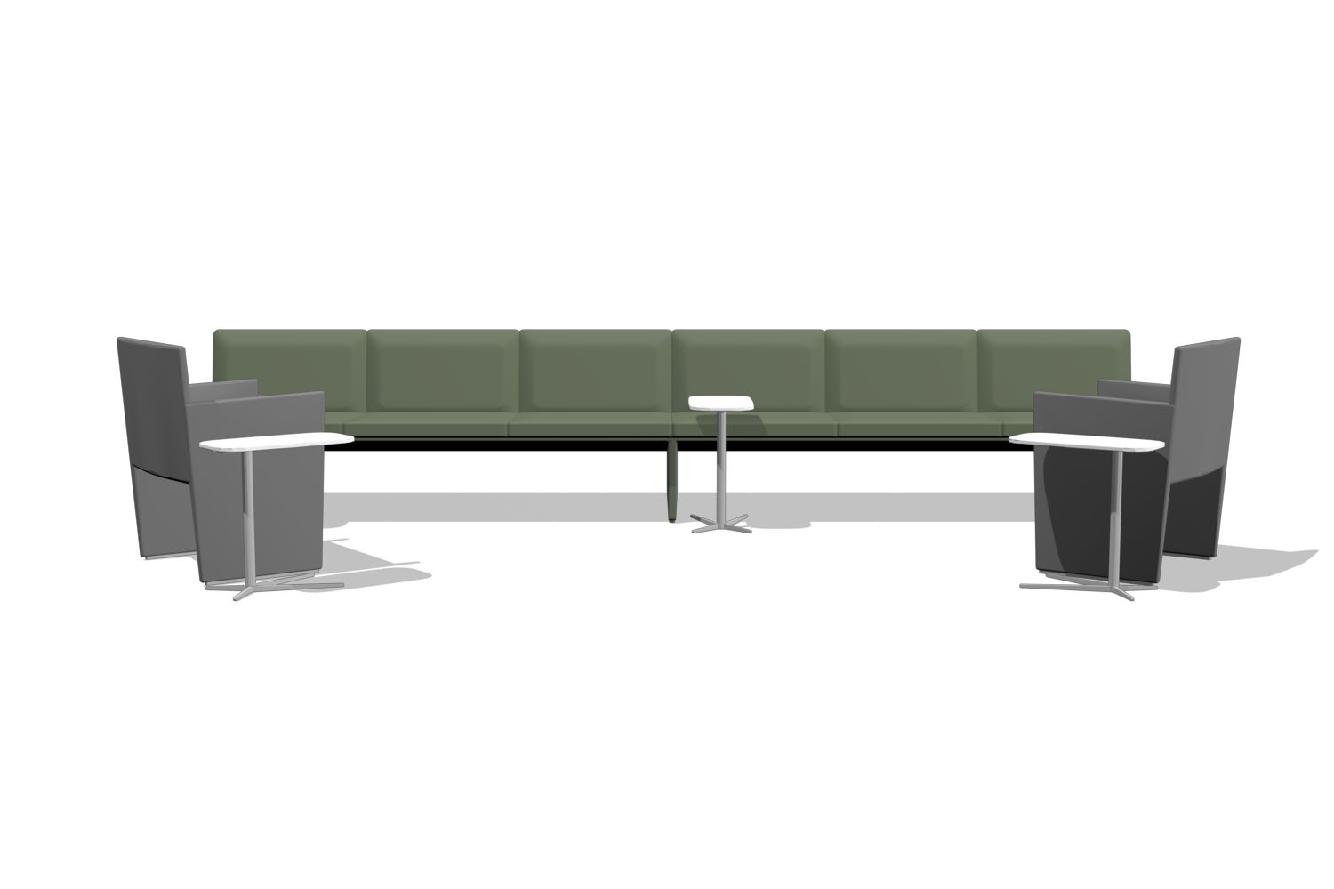 A versatile furniture system that creates informal meeting and collaboration spaces within open offices. The collection includes various seating heights and table options to support different work postures and activities.
