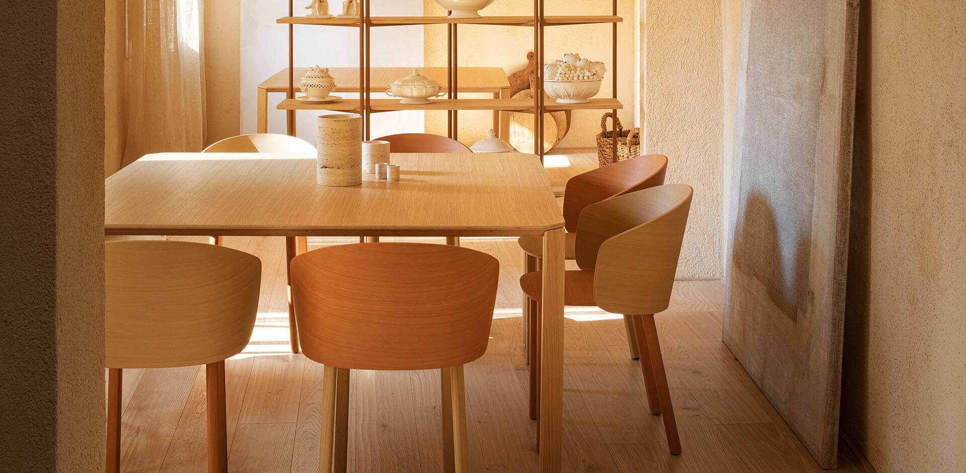 A versatile and elegant chair with a distinctive curved backrest made from molded plywood. Available in multiple finishes and base options, it combines comfort with refined Italian design aesthetics.
