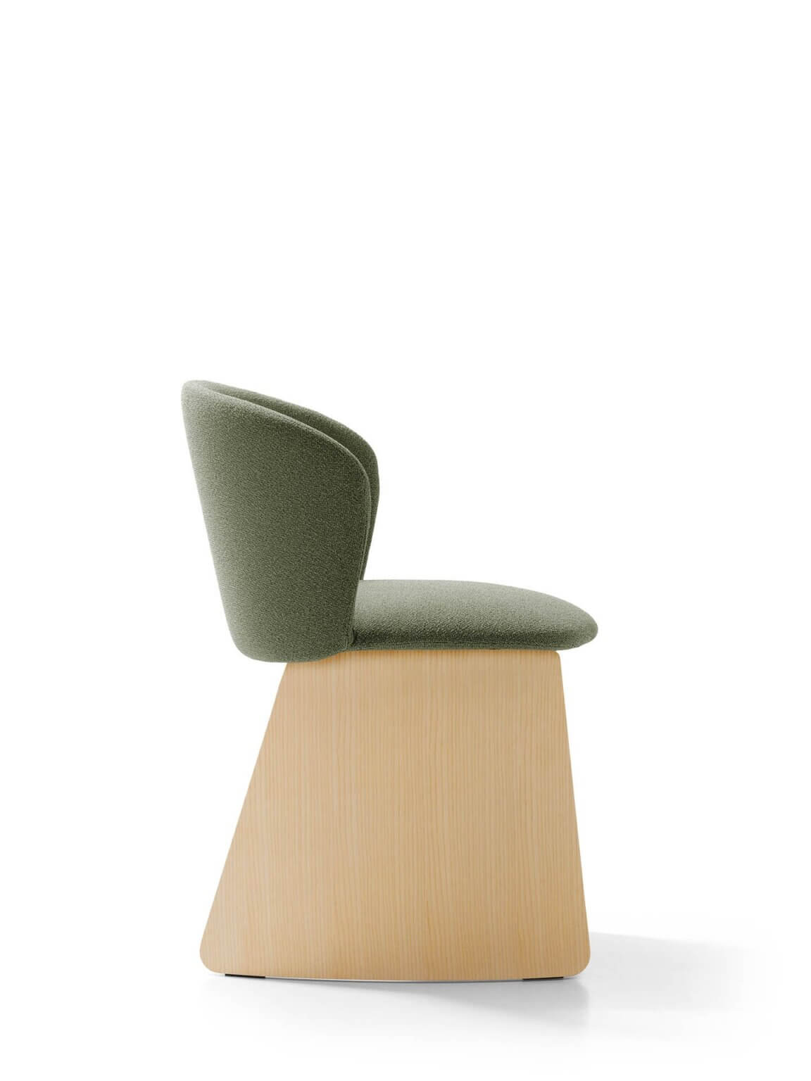 A sophisticated dining chair with a curved wooden backrest that flows seamlessly into the seat. The design emphasizes clean lines and natural materials for both residential and commercial dining spaces.