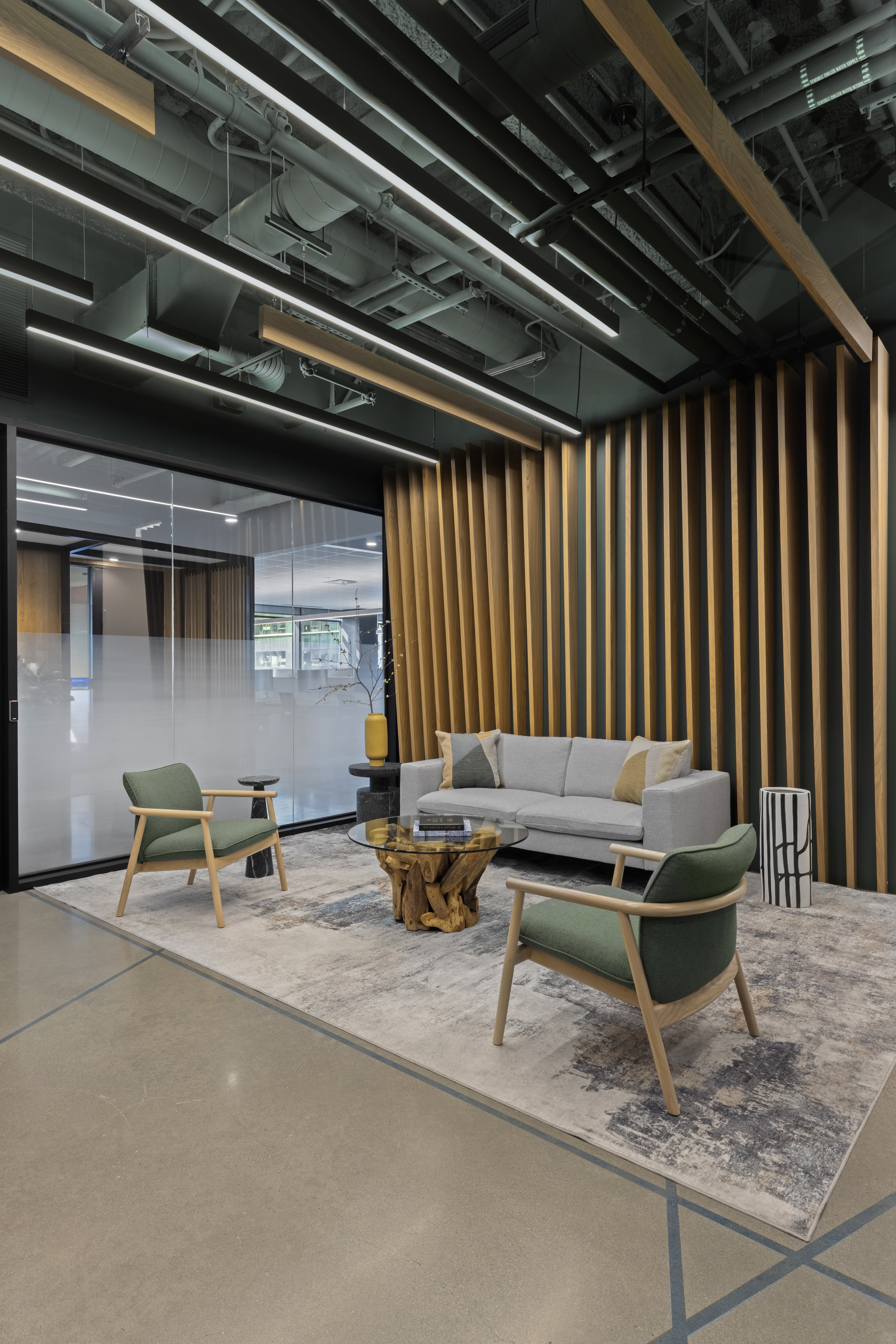 - Isomi Custom Reception Desk: A sculptural, branded feature that makes a bold first impression while tying together the earthy, Pacific Northwest aesthetic.